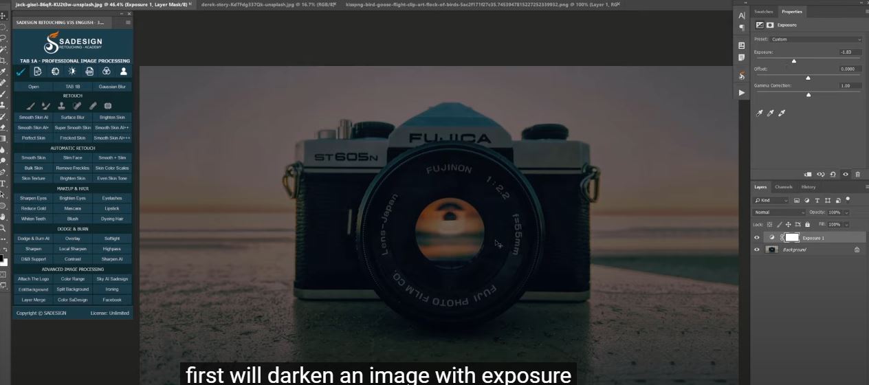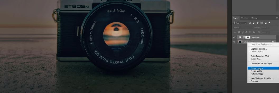 Hi there, let’s me show you how to create 3D Manipulation scene life in Photoshop. First, we will darken the image with exposure adjustment layer, decrease it to nearly -2, . Use brush tool (black in foreground color) and paint over the lens to bring back the brightness in this area.
