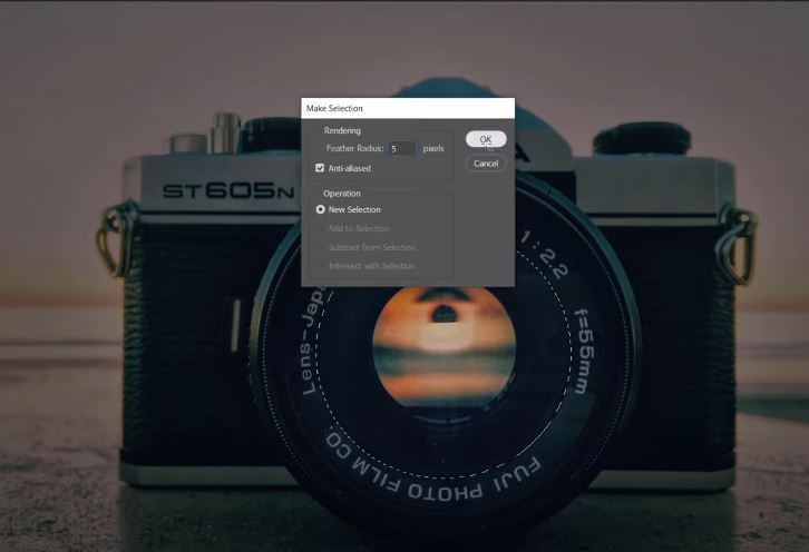 Next, we will select the inner lens to make the manipulation effect. Pick up Ellipse tool, choose “path” type and draw a selection to cover the area inside the lens. Freely to adjust each edges of the shape. Hit enter to complete Right click to the shape, choose make selection, feather 5 pixels and OK