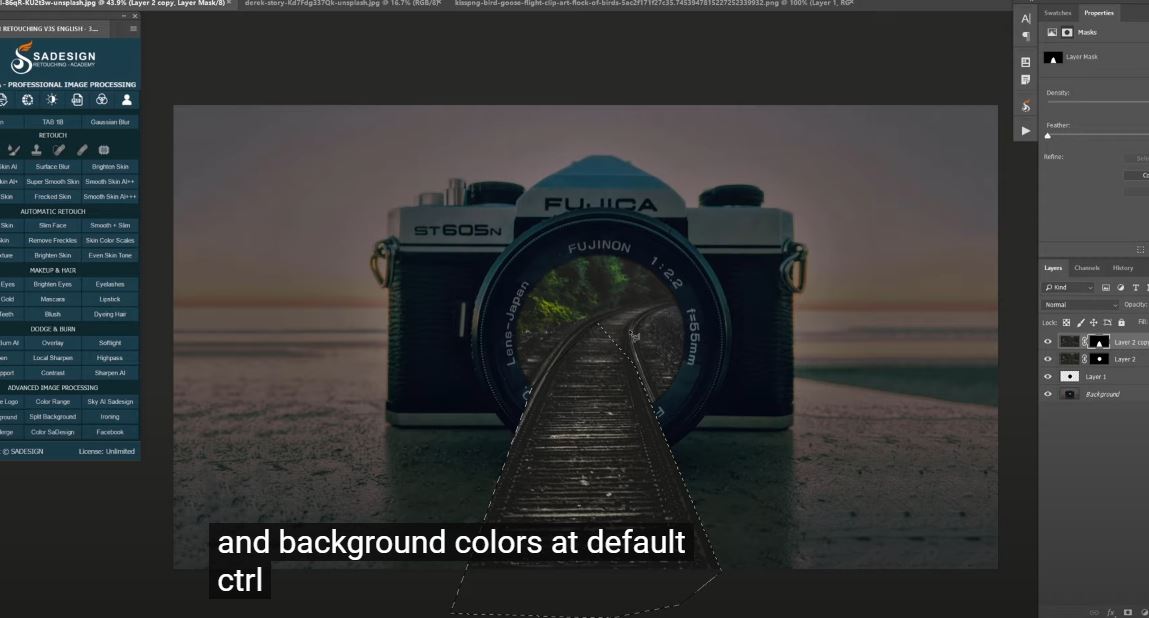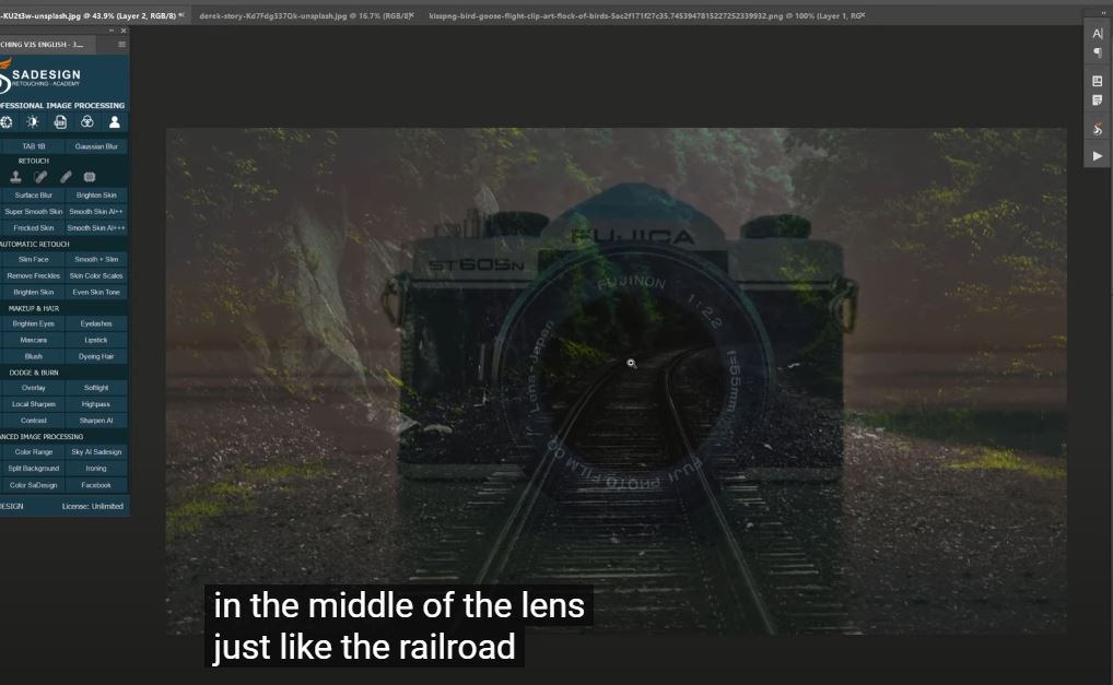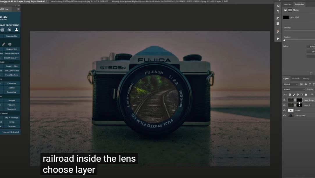 Create a new layer, press SHIFT+F5 to fill this selection with Black Now, take this railroad photo to our project by using CTRL+A and CTRL+C Paste it with CTRL+V, reduce opacity to 50% so we can see the camera behind, then press CTRL+T to move the railroad in the middle of the lens, just like the railroad goes through it. Bring back opacity to 100%. Duplicate it with CTRL or CMD + J