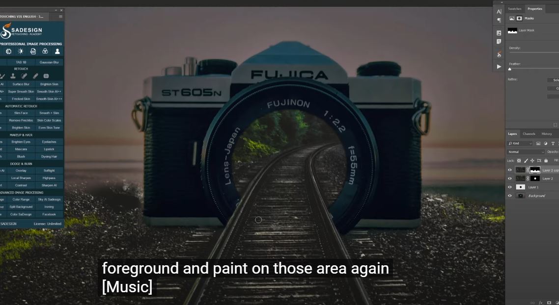 There you go! Now you can see the railroad inside the lens. Choose layer mask on top layer, use polygonal lasso tool and make the selection just like this, then press CTRL+Delete to reveal the rail in front of the lens. Before that, make sure the background color is white. If not, press D to reset the foreground and background color as default. CTRL+D to deselection.
