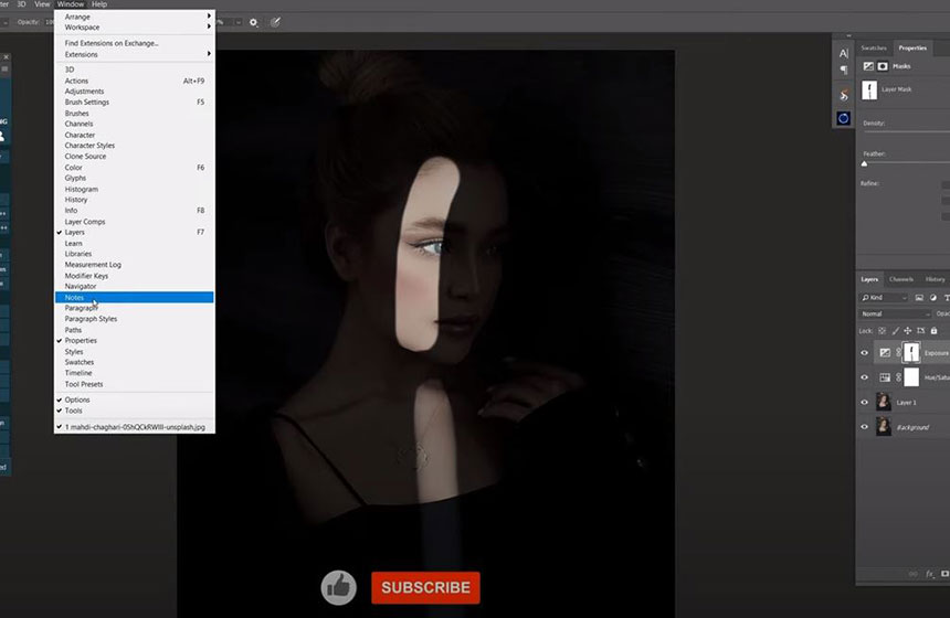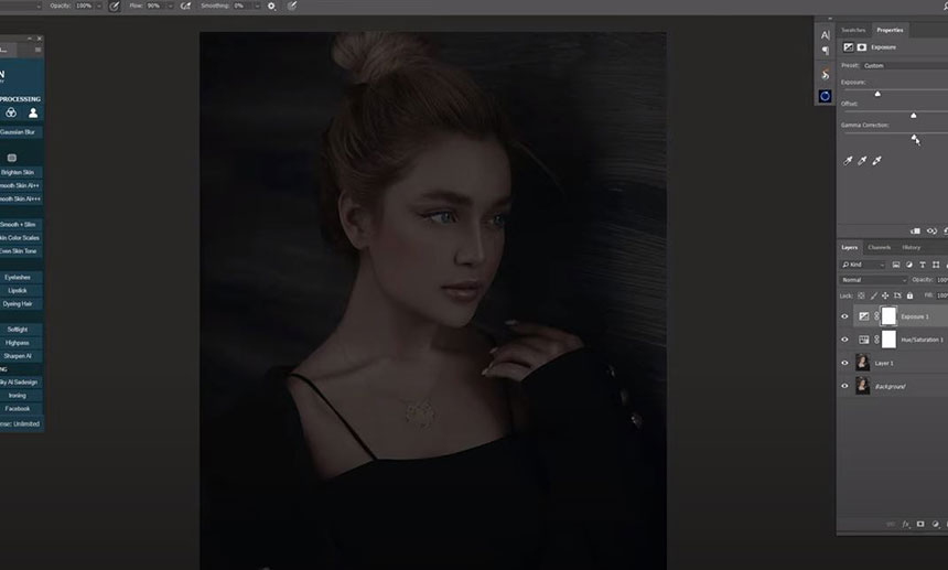 First, duplicate the background layer with CTRL or CMD + J. Click to this icon, then select “Hue/Saturation”. Decrease saturation to -30 Create Exposure adjustment layer, darken the image by sliding exposure to the left. It’s around -3.45, increase gamma correction to 0.67