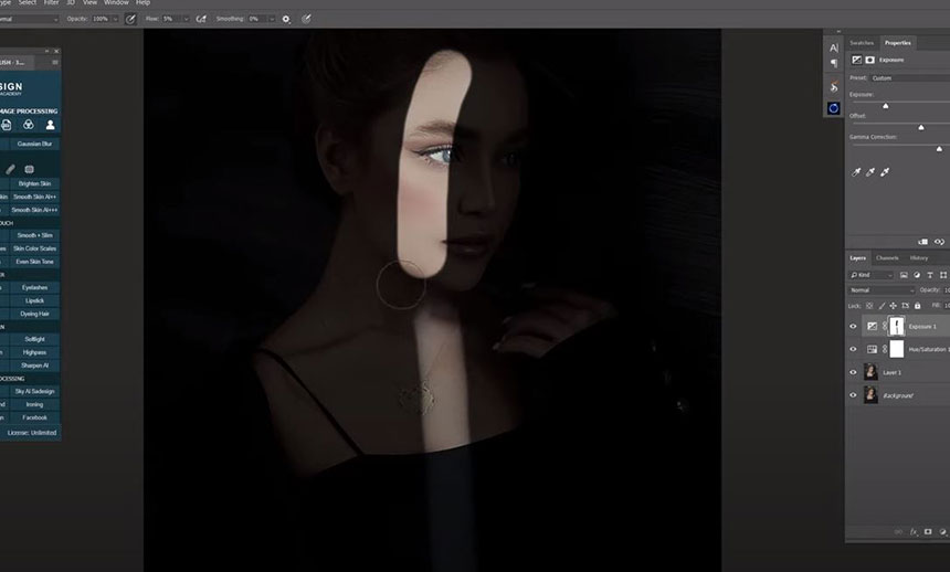 In its mask of exposure layer, use brush tool, click to the arrow icon, adjust hardness to 80%, flow 90%, foreground color is black. Paint a line just like this on her face. Adjust the flow to 5%, then draw a line where you want to add the light.