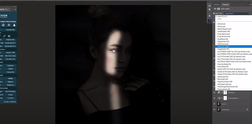 Create Hue/Saturation adjustment layer, decrease saturation to -50 Create Brightness/Contrast adjustment layer, increase brightness and contrast to 31 Create color lookup adjustment layer, select filmstock in 3DLUT file, set opacity to 30% In layer 1, use dodge tool, range in highlights, exposure 10%, paint on the areas you want to brighten.