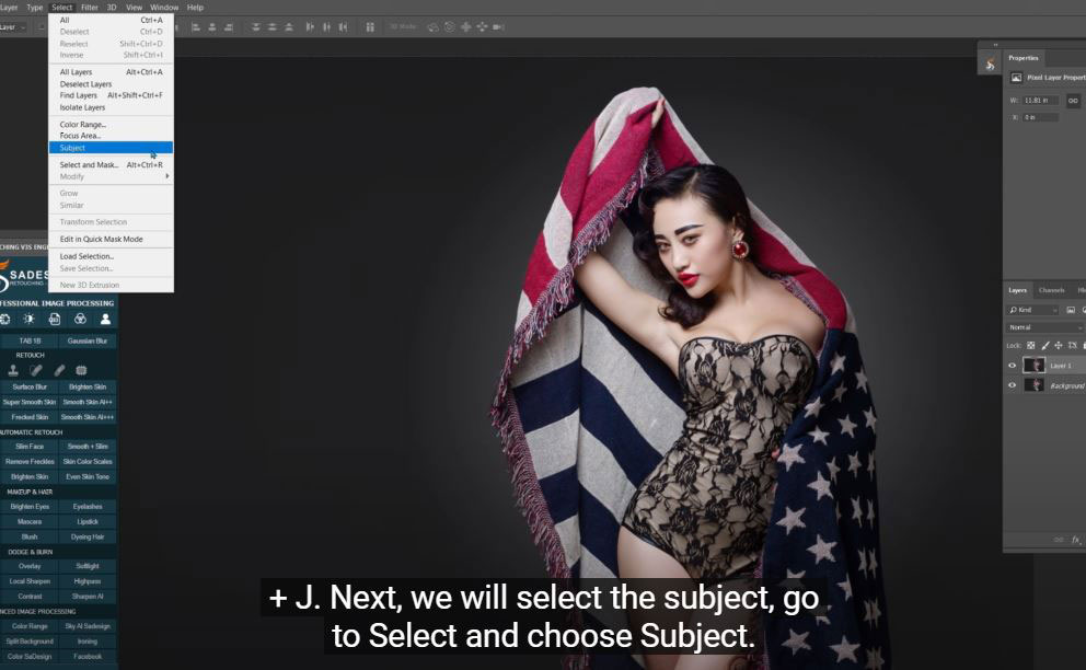 (1). The first thing we have to do that is copy the background layer by pressing CTRL or CMD + J. Next, we will select the subject, go to Select and choose Subject. Boom! Photoshop now ) utomatically select the subject for us and it looks quite good. For some areas that are still not selected, you can use Quick selection tool to add the selection.