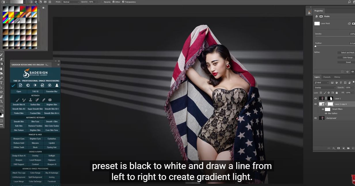 (10). Now, we will masking it and keep the light around the subject, not on the outside. Click to the layer mask button to create a mask, choose gradient tool and make sure the preset is black to white and draw a line from left to right to create gradient light. Let’s increase the opacity to maximum. Depend on the shape of your imagine window, you can estimate the source of light will hit on the subject and the background. Once, you are done with the left side, let’s move to the right one, this time, we have to choose the preset of gradient map is black to transparent, not black to white or something else. Now, add a bit of light to the right.