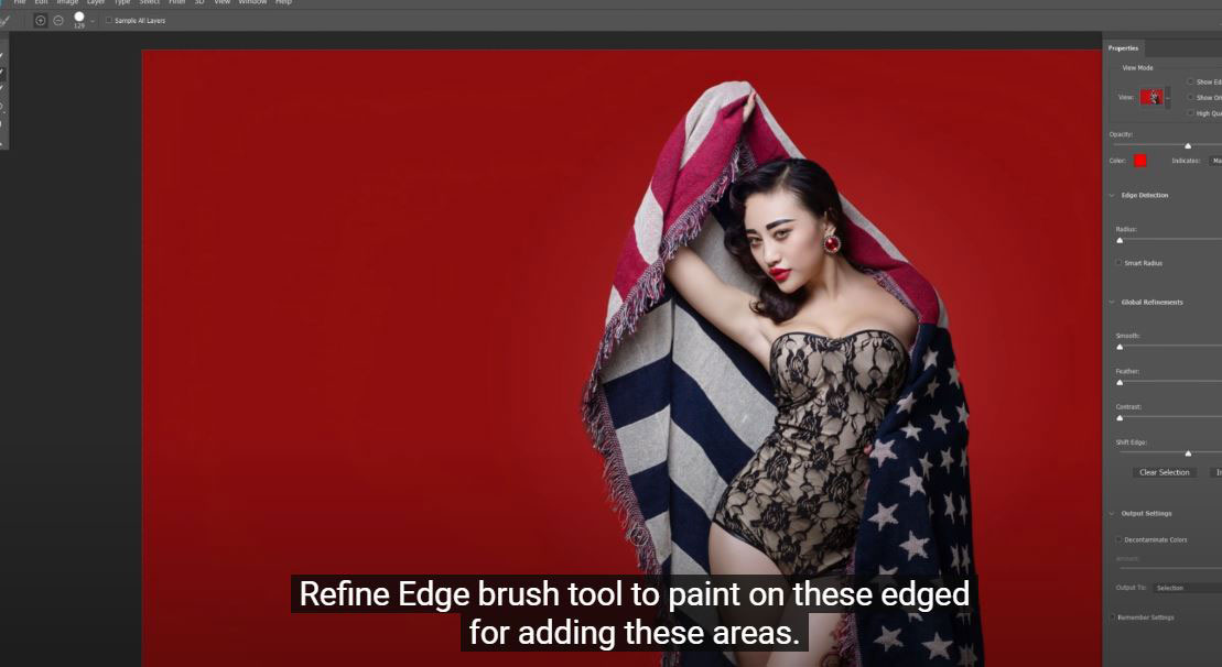 (2). We will notice the edge of towel is not selected, go to Select > Select and Mask and using the Refine Edge brush tool to paint on these edged for adding these areas. Once you’re done, choose “Selection” in output to box, and OK.