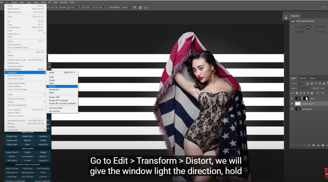 (7). Go to Edit > Transform > Distort, we will give the window light the direction, hold SHIFT, click to the corner and drag it to make the direction. If you’re not use SHIFT, the movement when you dragging it can be hard to control. Let’s move it a little down and press Enter.