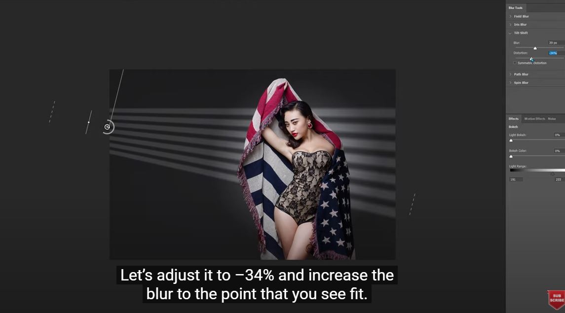You can control distortion as well if you want to. Let’s adjust it to –34% and increase the blur to the point that you see fit. Press Enter when you are finished with the adjustment.