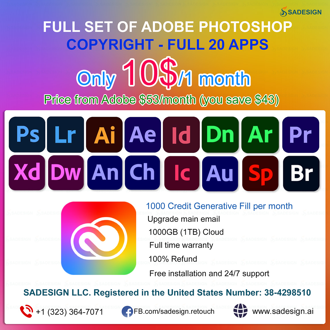 Adobe Photoshop copyright (Full all APPs including software: Photoshop, Lightroom classic (computer), Lightroom mobile (phone), Adobe Premiere, Media Encoder, After effects, Adobe Illustrator, Adobe Fresco, Adobe Fonts, ... and all other software in the Adobe Creative Cloud suite), used separately and not shared with anyone. License to use the latest Adobe Firefly full features on Photoshop Beta A.i.