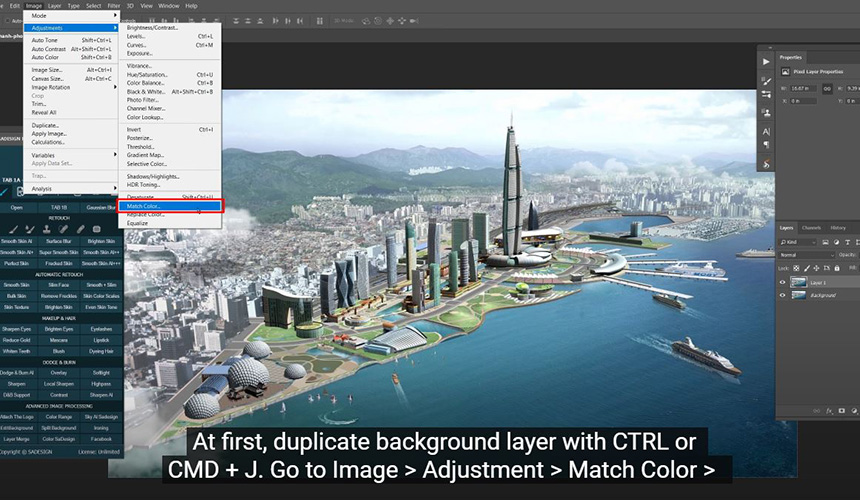 At first, duplicate background layer with CTRL or CMD + J. Go to Image > Adjustment > Match Color > in source, select su8.jpg, I’ll leave the file in the description. Decrease the Luminance to 67 and increase Color intensity to 113, then OK.