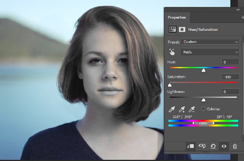 To make the hair black, we need to desaturate the hair color first and then we will darken it to make it black. To desaturate the hair color, go to Layer > New Adjustment Layer > Hue/Saturation and select Reds and now desaturate the red by dragging the Saturation Slider to the left.