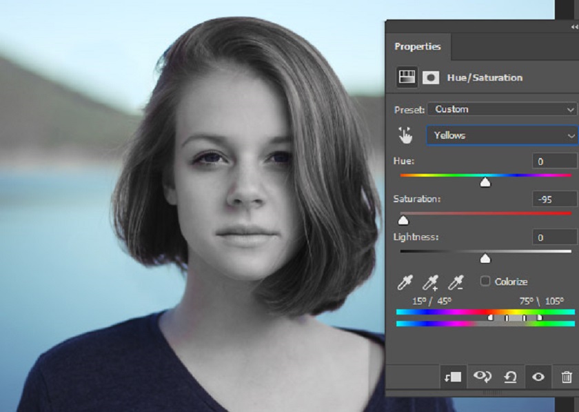 As you may have noticed that the hair also has a striking blonde color. We also need to remove that to target the yellow highlight using Yellow . so after Reds choose Yellows to desaturate yellow.