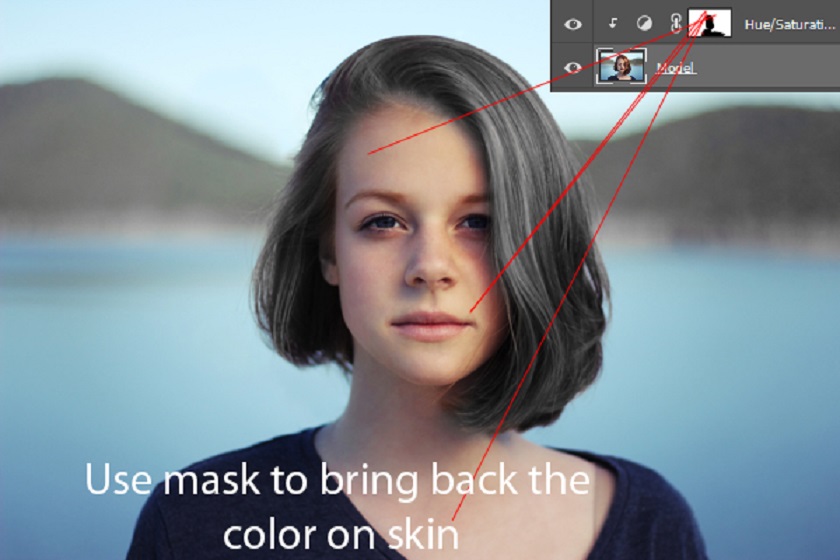 Again use a Hue/Saturation mask to bring back the skin tone by painting over it with a black brush. Like I said, we'll be using a mask throughout the tutorial to keep the skin tone.