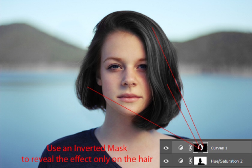 Click on the Curves mask and press CTRL + I to create an inverted layer mask. Then use a soft white brush to reveal the dark effect only on the hair. This will make the hair darker and darker than we want. Take a look at the results below and we have black hair.