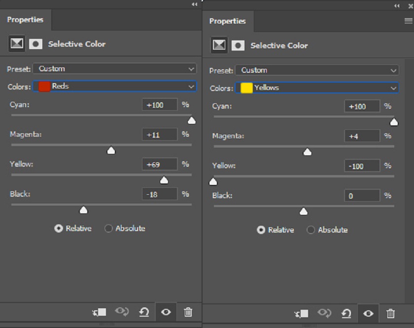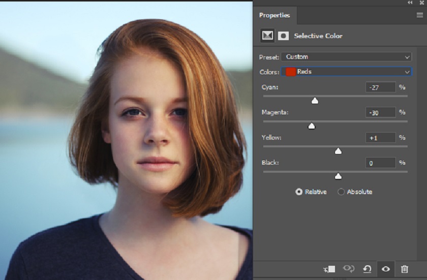 Now we will change the hair color to brown. Coloring her hair brown was an easy job because my model has red hair. We will now target the red using the Select Color adjustment. It is very easy to define red hair using this adjustment layer. Go to Layer > New Adjustment Layer > Selective Color . Change the settings of Red & Yellow to turn red hair into brown hair. You can see my settings in the image below, and you can pretty much use the same settings if your model's hair color is red. If you need to tweak the settings, do it.