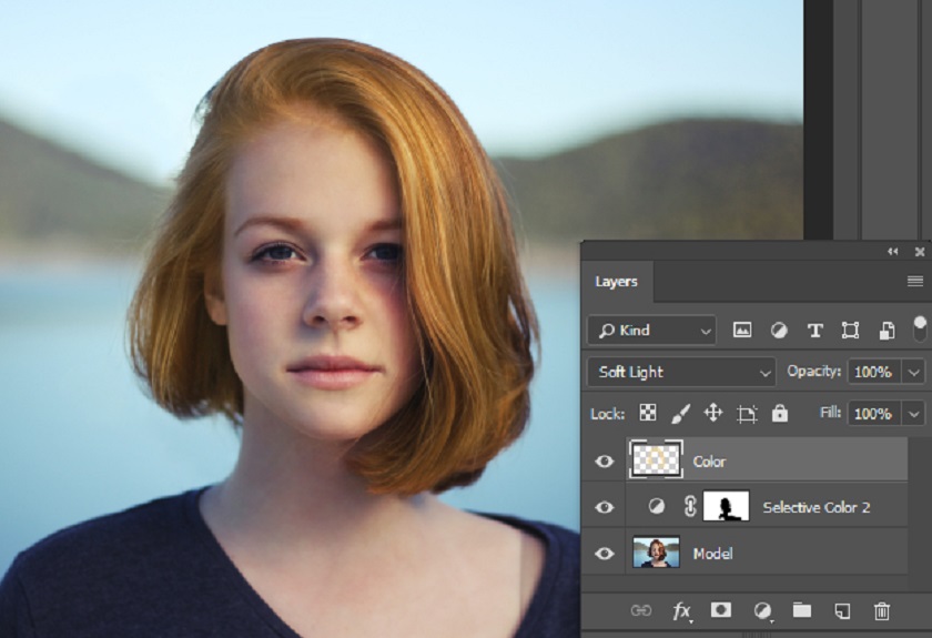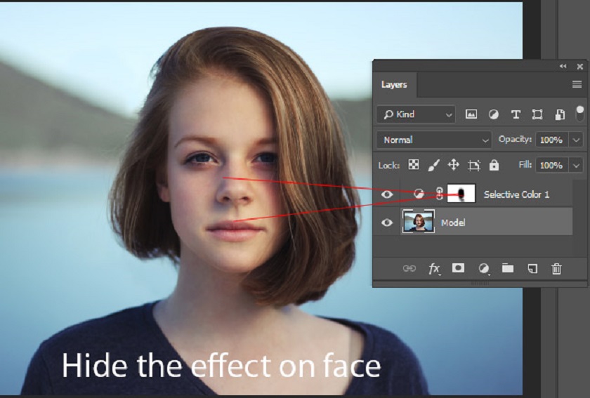 As you may have noticed, it changed the skin color of the model as well as it had a red tint. We need to fix it, to do that remove the effect of Selective Color on the skin by painting over the mask with a black brush.