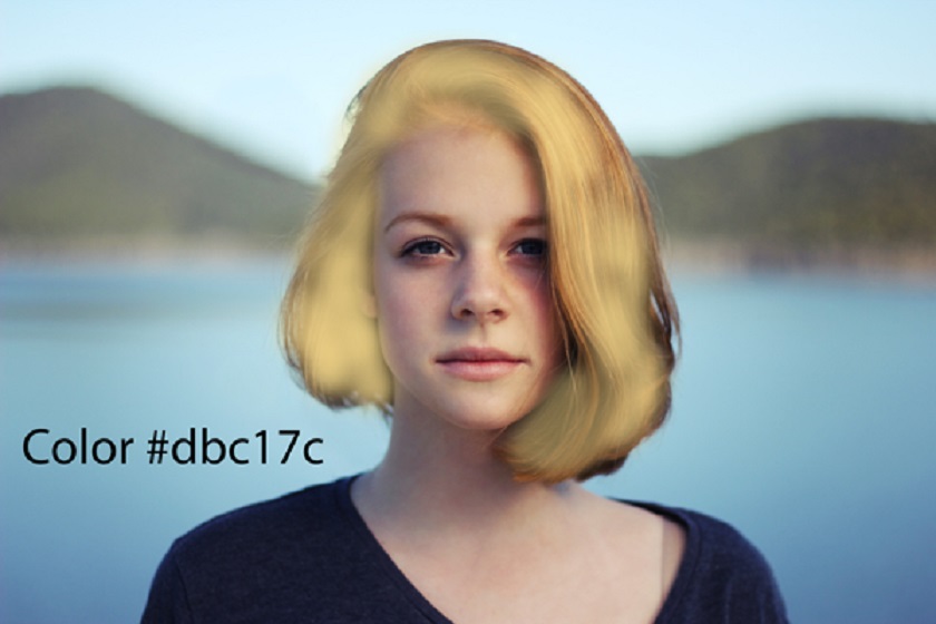 Create a new layer by pressing CTRL + SHIFT + N and name it “Color”. Picked a yellow color and I chose this color # dbc17c . Use a soft brush to paint on the hair. See pictures below for reference.
