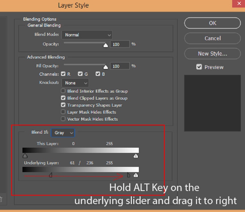Double-click the white layer to light up the Blending Option dialog box. Go to the Blend IF section, hold down the ALT key and drag the black slider to the right. The slider will split and you can drag both to the right, which means it will help blend the white into lighter areas of hair, creating more realistic highlights.