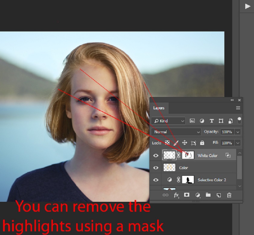Finally, you can control where the highlights are visible using a mask. Add the mask to the white layer by Layer > Layer Mask > Reveal All and using the black brush remove the highlights they can't be seen like the left side or maybe if you paint too much white you can fix it here.