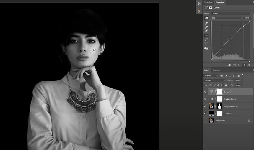Create curves adjustment, choose “hand” icon and select the highlight areas on her face. Dragging up and down to increase or decrease the highlight.