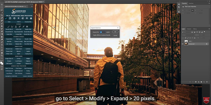 Next step, we will remove the subject in background layer, now just move to background layer, go to Select > Modify > Expand > 20 pixels. Press SHIFT+F5, choose content-aware in contents box and OK.