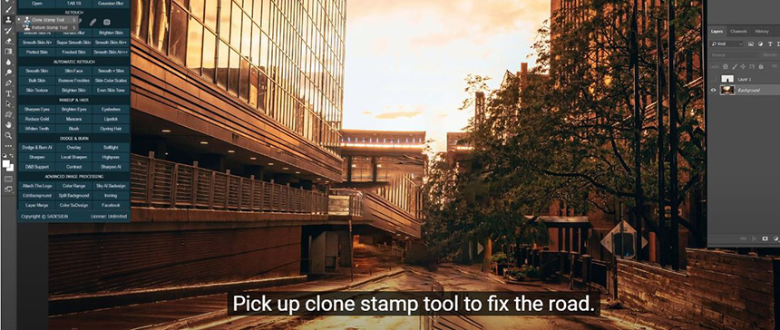 Pick up clone stamp tool to fix the road. To use this tool, you have to take the sample by hold ALT and click to the sample. Then, paint to apply the sample to the destination.