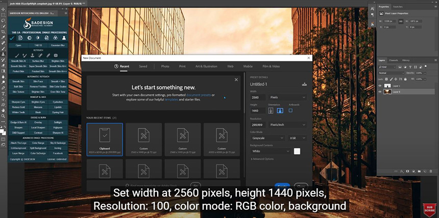 Set width at 2560 pixels, height 1440 pixels, Resolution: 100, color mode: RGB color, background content: White and create.