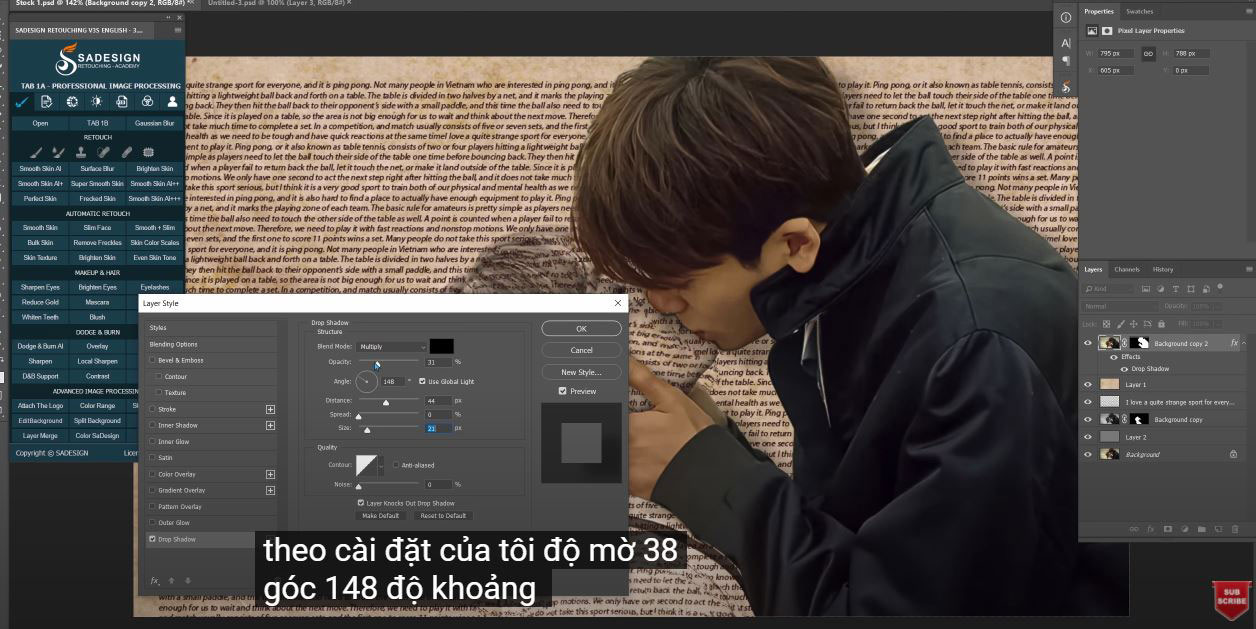 Select the top layer, go to Blend Options to add shadow in “Drop Shadow”, you can play with these options or follow my settings: