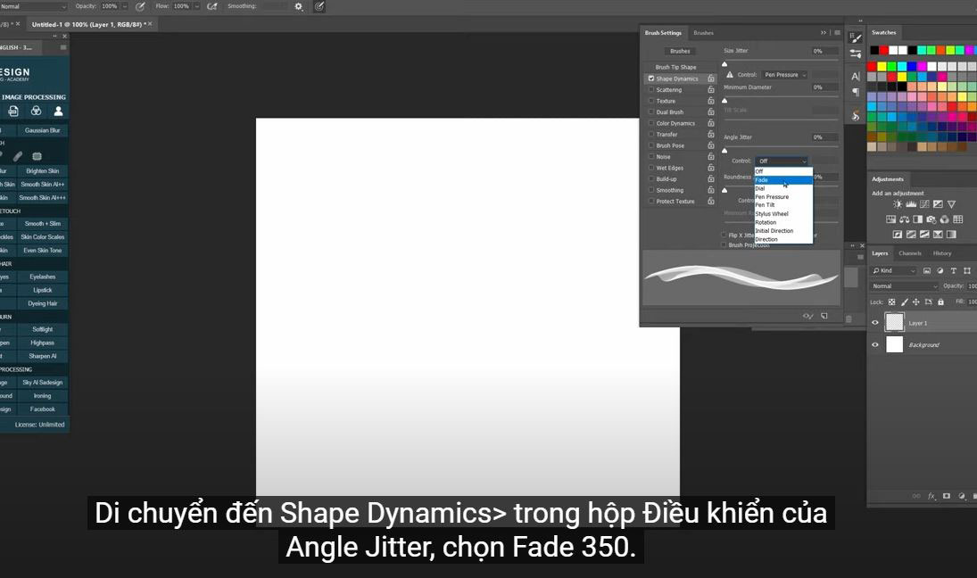 (7). Move to Shape Dynamics > in the Angle Jitter's Control box, select Fade 350. Click the small page icon to save this setting.