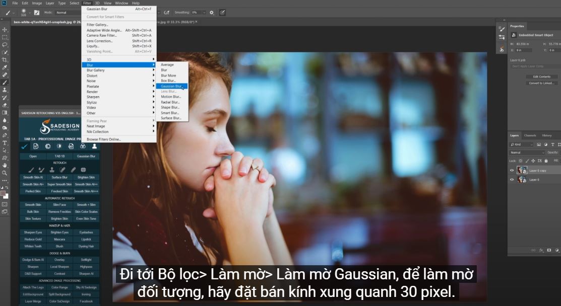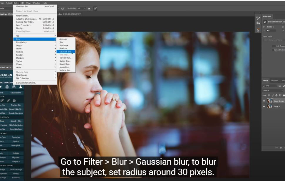 (1). First of all, right click on the background layer, select “convert to smart object” so it can be edited non-destructively and press CTRL or CMD + J to duplicate it. Go to Filters > Blur > Gaussian Blur, to blur the object, set a radius around 30 pixels.