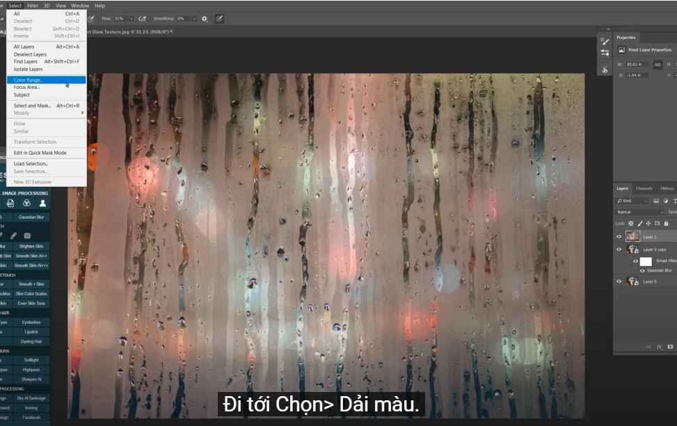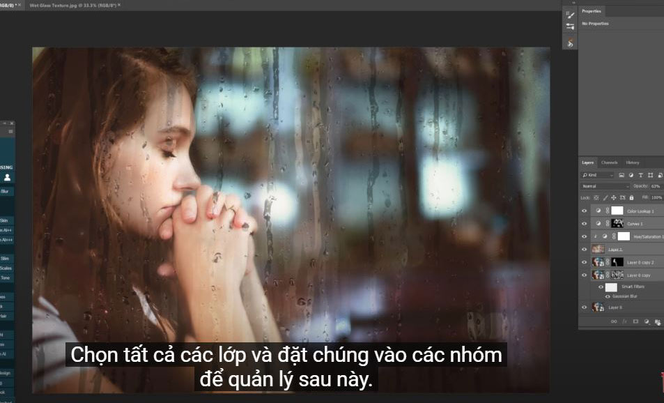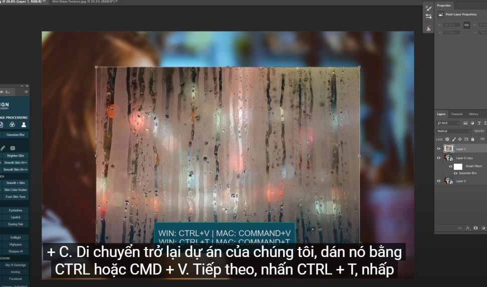 (2). Go to wet glass photo here, you can take any photo you like by downloading it in shutter stock or any available resource. If not, you can download this image at the link in the description. Now we will select the whole picture, press CTRL or CMD + A and copy it with CTRL or CMD + C. Move back to our project, paste it with CTRL or CMD + V. Next, press CTRL + T, click and drag it outward while holding SHIFT and ALT keys to expand the image from the center, then press enter when you are happy with it.