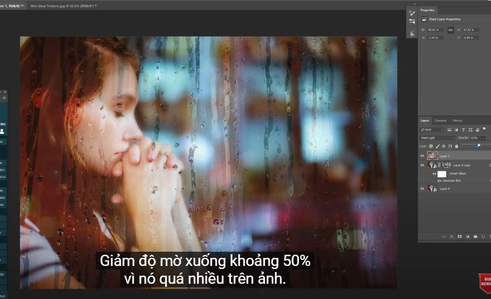 (5). Next, turn layer 1 back on and change the blend mode to hard light. Reduce the opacity to about 50% because it's too much on the photo. If you find the color quite dark, to reduce it, make a Hue/saturation adjustment and lower the saturation to –68. Make sure to select the first small icon to create a clipping mask to the glass. This helps to control saturation that affects only the wet glass, not the subject.