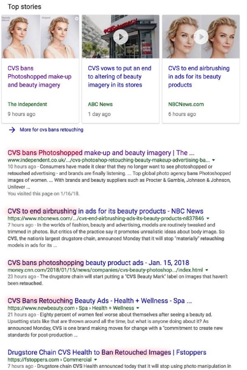 The full CVS statement is available here: CVS Pharmacy Committed to Creating New Standards for Transforming Post-production Beautiful images. The press release states: “[CVS] has announced a commitment to creating new standards for post-production change of the beautiful images it generates for stores, websites, social media and any marketing materials…. The company also announced that it will be introducing the “CVS Beauty Mark,” “a watermark that will be used to highlight images that have not been physically altered.” The notice goes on to define a material change to mean any image that changes or enhances “a person's shape, size, proportions, skin or eye color, wrinkles, or any other personal feature.” any other". Honestly, this has nothing to do with banning the edit, a point that has clearly been lost amid the frenzied reports. The aim here is to help consumers know when they are viewing authentic images rather than digitally altered or enhanced images - that is, images that depict an unrealistic representation of the product. described person. “CVS Beauty Mark will start appearing on beauty images produced by CVS Pharmacy in 2018 with the goal that all images in the beauty sections of CVS Pharmacy stores reflect transparency by the end of 2020.”Where do news reporters get their news?