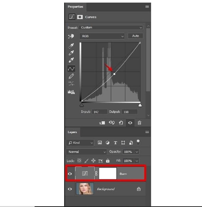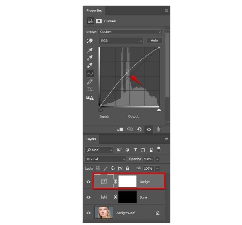 You can watch her share about the tools and how to use them in the video below. [embed]https://www.youtube.com/watch?v=yO9YZKUivOU[/embed] In the video, Noble explains what settings she uses to place her brushes and also how she relies on curves to work with Dodging and Burning. While she doesn't go into detail when it comes to color correction, she does touch on interesting points that you can then explore further. For better visualization, you can refer to the following steps to practice with Dodging and Burning Step 1: Create a new layer Create a new Curves adjustment layer by: Layer > New Adjustment > Curver... then click OK in the dialog window. You name it Burn. Then lower the midpoint of the curve. Simply click on it and drag it down.