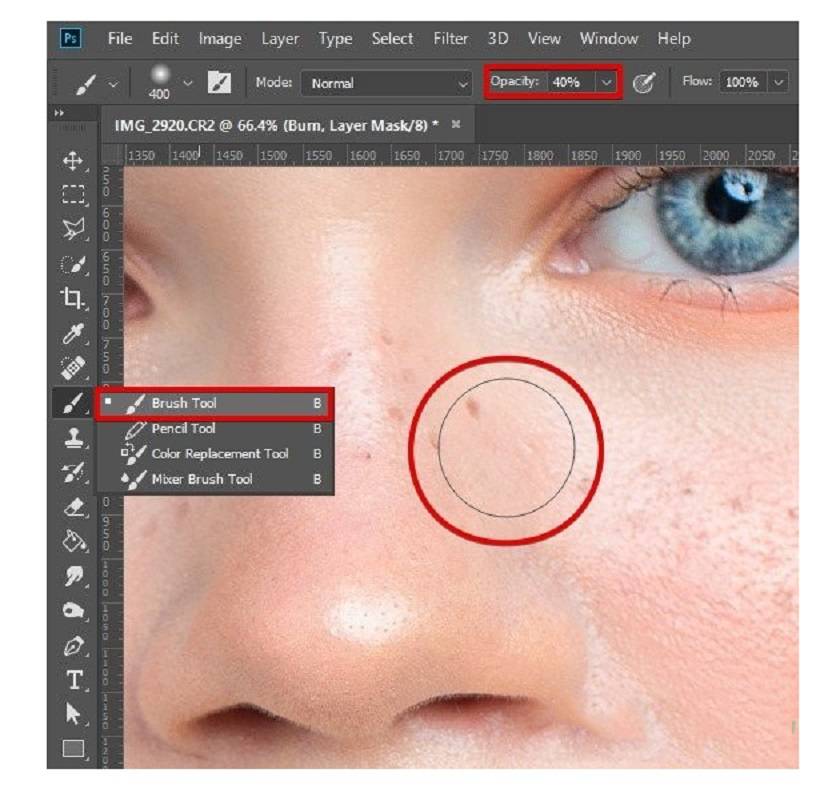 Step 4: Invert the Dodge layer You also do the same as when step 2 Step 5: Start using Dodging and Burning Select the Brush Tool (B) and set the opacity to 40% Then improve the model skin by lightening the dark and light areas of the face.