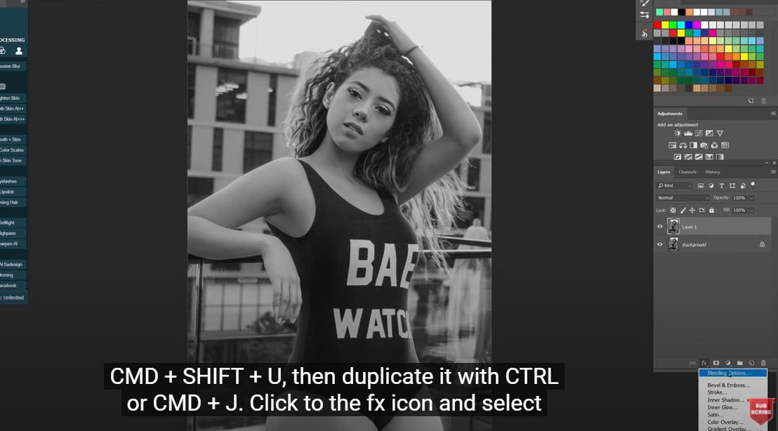 (1). At first, remove the color of this beautiful girl to black and white by pressing CTRL or CMD + SHIFT + U, then duplicate it with CTRL or CMD + J. Click to the fx icon and select “Blending Options”, in the advance blending, we will turn off R channel which means Red.