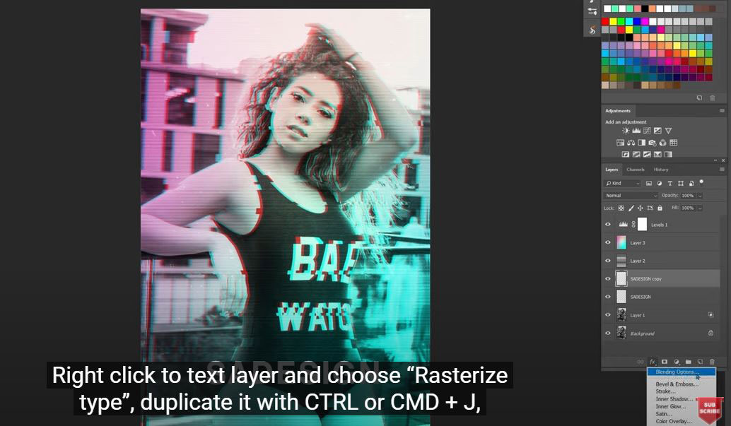 (10). Right click to text layer and choose “Rasterize type”, duplicate it with CTRL or CMD + J, open Blending Options and turn off R channel just like the begin step. Now, move it to left or right to create the effect.