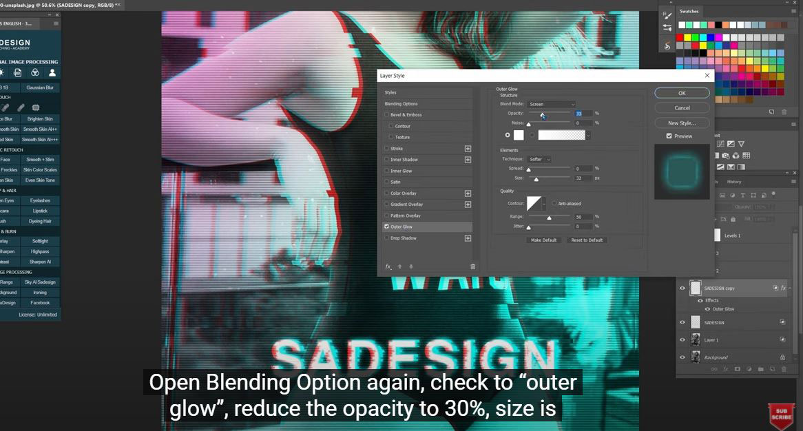 (12). Open Blending Option again, check to “outer glow”, reduce the opacity to 30%, size is around 16 pixels and OK. Similarly, we will add outer glow effect to SaDesign layer, this time, increase the size to 59 and opacity to 53%
