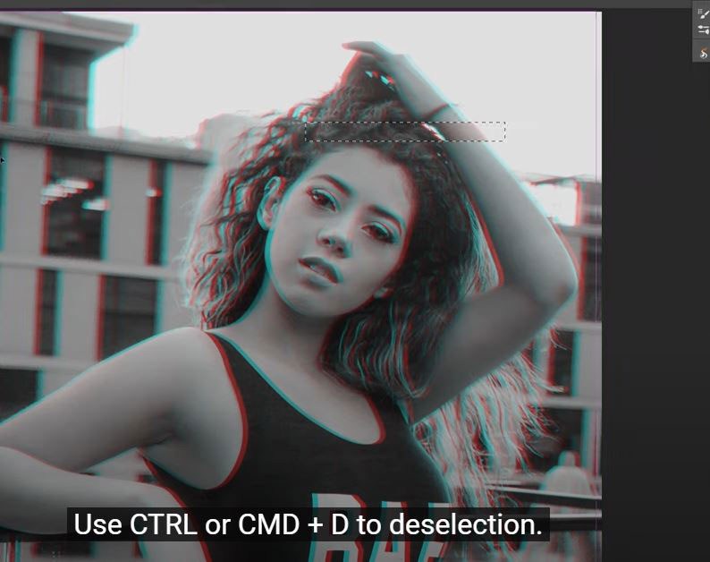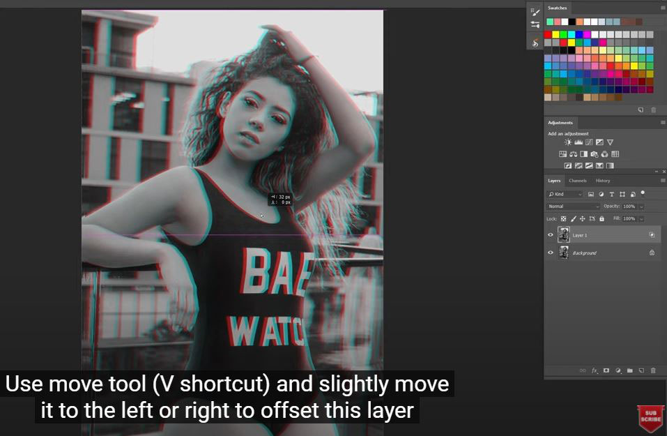(2). Use move tool (V shortcut) and slightly move it to the left or right to offset this layer from the original. You can also use the keyboard cursor keys to move the layer. Now, you will see the anaglyph effect.
