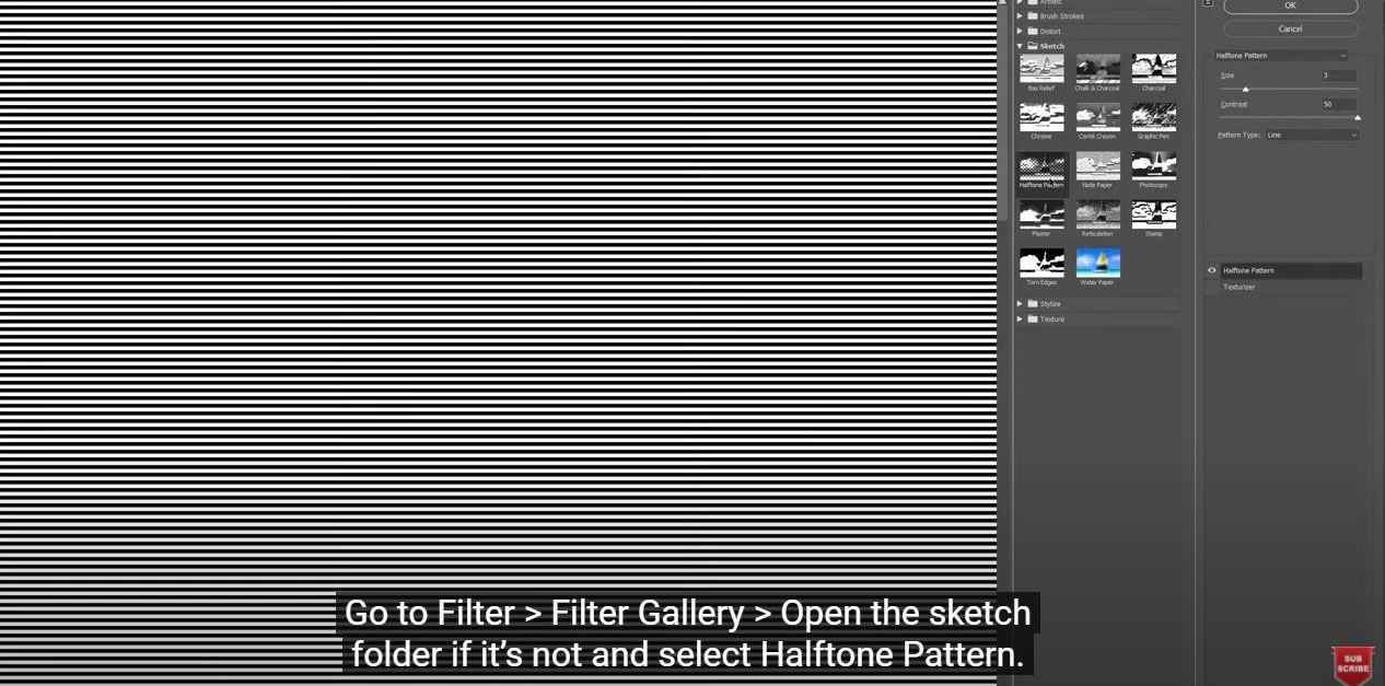 (6). Go to Filter > Filter Gallery > Open the sketch folder if it’s not and select Halftone Pattern. Ensure the pattern type is “Line”, size is 3 and contrast is 50, then OK.
