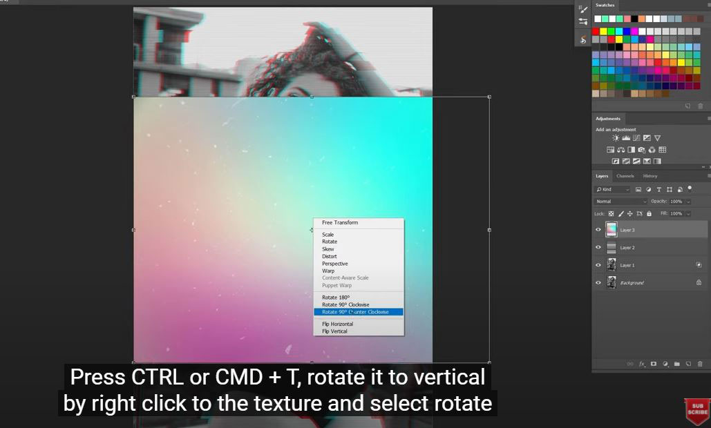 (8). Next, add color to it, pick any texture that you’d like to add to the image. I’ll take this one, just copy it to our project. Press CTRL or CMD + T, rotate it to vertical by right click to the texture and select rotate 90 degrees. Expand it to cover the photo and Enter. Just change to overlay in blending mode and see the difference.