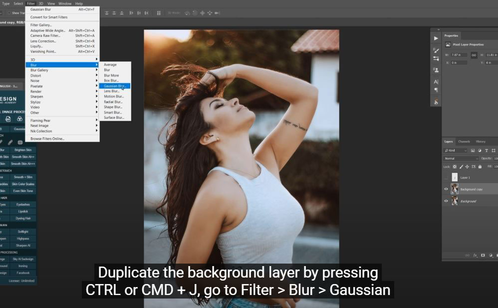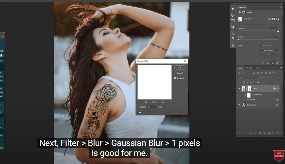 (1). First, I have the tattoo layer and the photo that I want to put the tattoo on. Duplicate the background layer by pressing CTRL or CMD + J, go to Filter > Blur > Gaussian Blur and set the radius at 3 pixels.