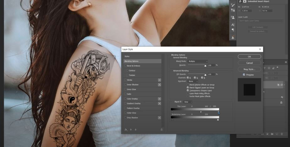 (4). The background of tattoo layer is still visible, to remove it. Go to Blending Options and reduce the half white triangle to 162 and the other to 219. It’s not completely gone away so now we will use eraser tool to remove it, before that, add layer mask to the tattoo layer and slight remove the corner, edges that has left on the tattoo layer.