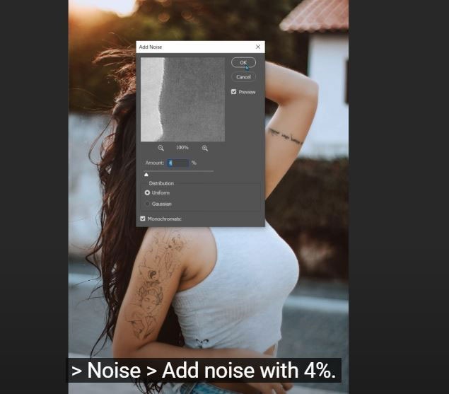 (6). Now, we will make the tattoo looks more realistic, duplicate the background layer and put it on top, go to Image > Adjustment > Desaturate, change to “screen” in blending mode and convert to smart object. Press CTRL + ALT + G for Window or CMD + OPTION + G for MAC to clipping mask it to the tattoo layer. Don’t worry about the tattoo now, add a little bit of noise to it by going to Filter > Noise > Add noise with 4%. Reduce the opacity to the point that you see the tattoo looks real. Group all layers and enjoy!