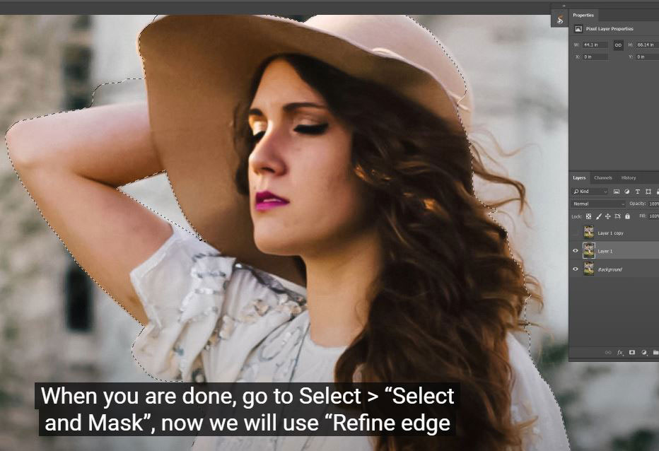(2). When you are done, go to Select > “Select and Mask”, now we will use “Refine edge brush tool” and paint slightly to the edge of her hair so that Photoshop automatically select on hair and exclude the background. This method I use most of the time when it comes to subject selection.