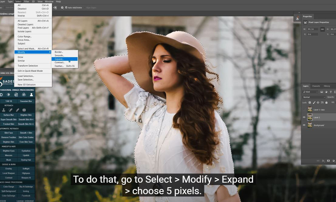(3). Next, we will expand the selection to make sure we cover all the subject. To do that, go to Select > Modify > Expand > choose 5 pixels. Then, Edit > Fill, we will choose the content-aware to fill the subject with background but do keep in mind that we will have the selection of the subject. Now, turn on back the layer 1 copy and add layer mask to it which is automatically separate the subject with background.