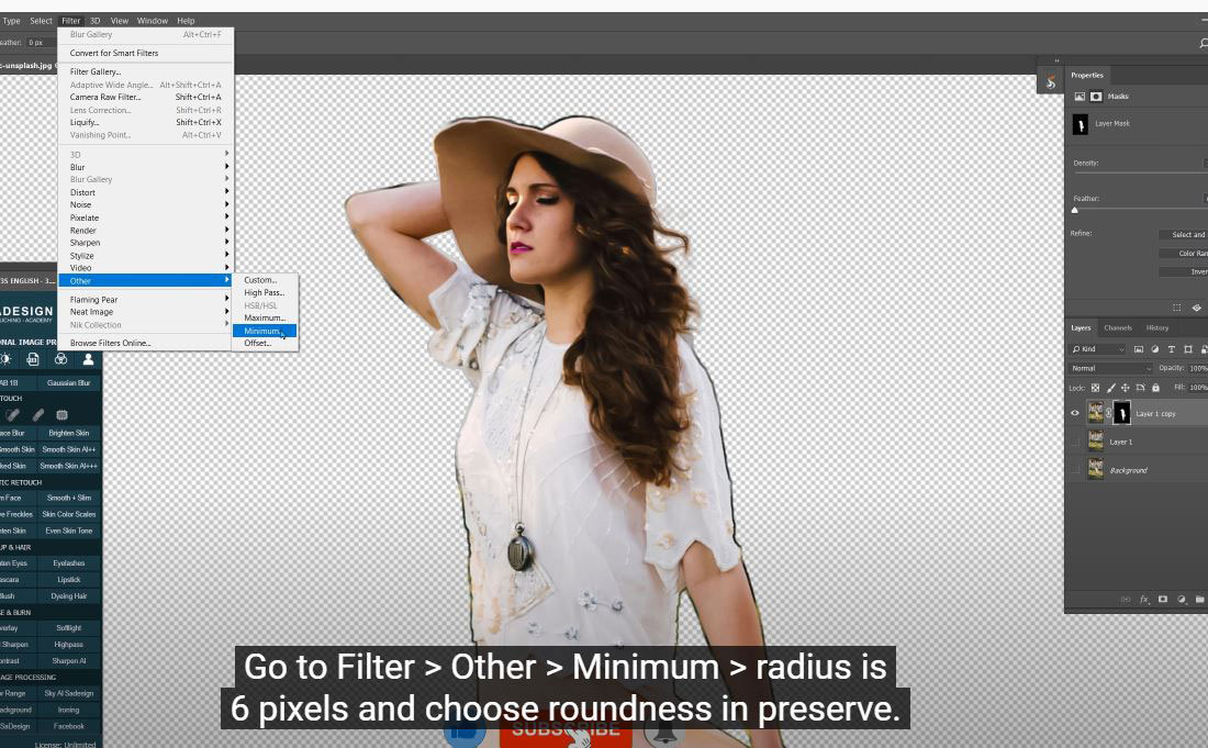 (4).To see it, turn off both below layers, don’t worry about the edges of subject. We will deal with it right away. Go to Filter > Other > Minimum > radius is 6 pixels and choose roundness in preserve. Now, the border of subject is removed.