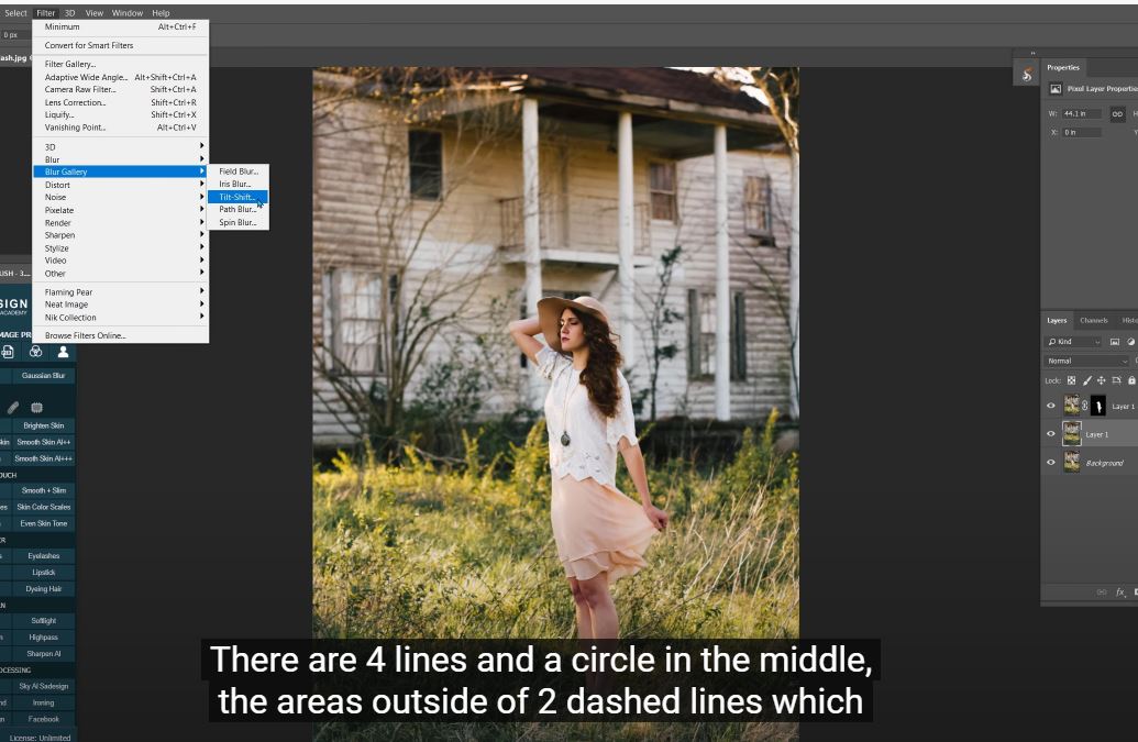 (5). We already separate subject with background. Next, we will blur the background, Filter > Blur Gallery > Tilt-shift. There are 4 lines and a circle in the middle, the areas outside of 2 dashed lines which are the top and the bottom will be blur by this filter. The center still in focus, let me increase the blur with the circle in the middle so you can see what’s this filter can do. For the 2 solid line next to the circle, everything inside of them will remain intact, but not the outside. It will blur.
