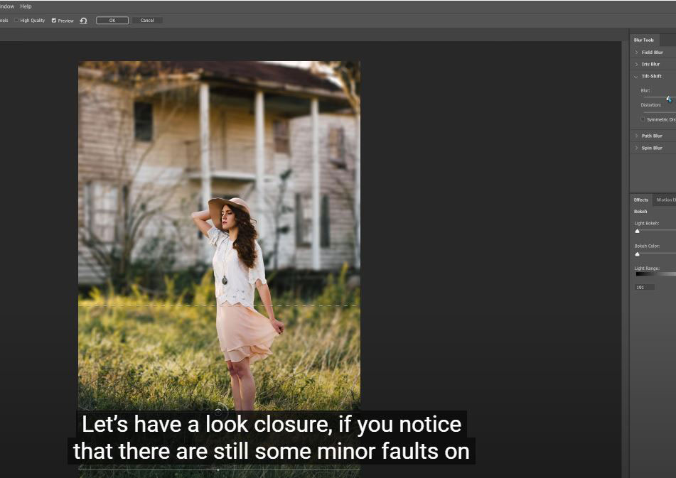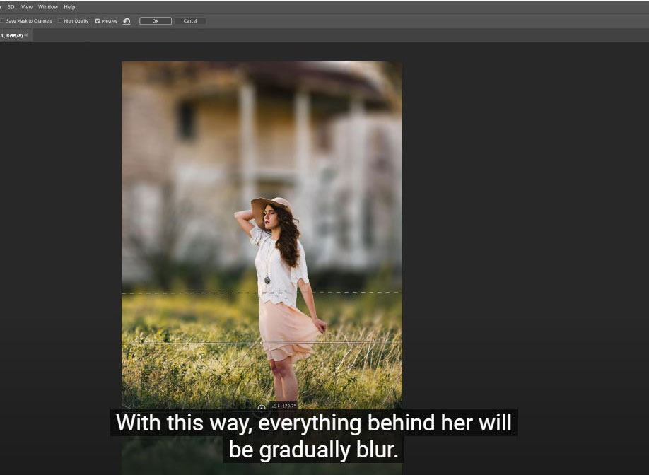 (7).In the real photo, the model will be in focus, to do that, pull down the focus area to the place where she’s standing. With this way, everything behind her will be gradually blur. Reduce the opacity to get the better blur effect.