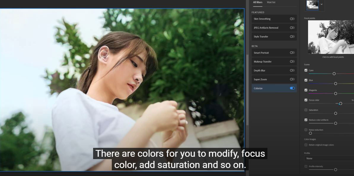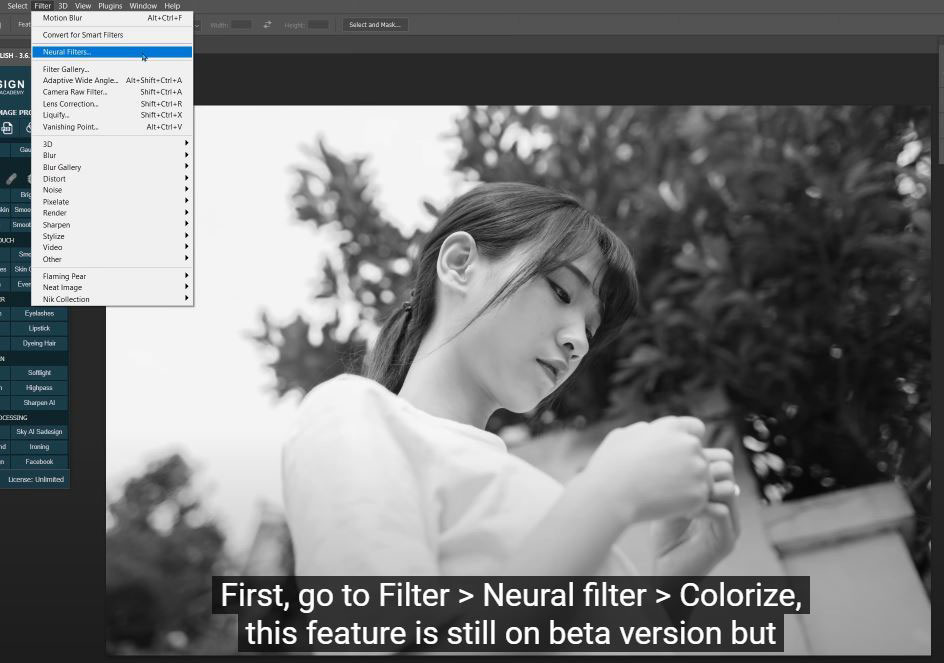 (2). Here, I have this beautiful girl in black and white photo. First, go to Filter > Neural filter > Colorize, this feature is still on beta version but it works really well, right? Please notice that, this feature is available on the latest version. If you are using old one of Photoshop, make sure to update it.